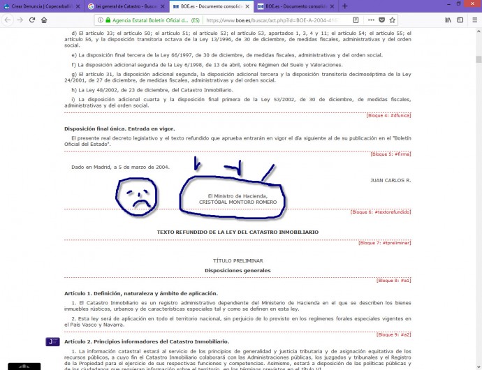 Nada chico, que non te enteras. Vouche refrescar a memoria. Déixote aquí a lexislación vixente en materia de Catastro Inmobiliario. https://www.boe.es/buscar/act.php?id=BOE-A-2004-4163 Real Decreto Legislativo 1/2004, de 5 de marzo, por el que se aprueba el texto refundido de la Ley del Catastro Inmobiliario. Como podes ver meu rei, non é Celso Fernández o que firma (fun mirar a ver se fora él porque tampouco é santo da miña devoción). Esta lei é asinada por Cristóbal Montoro (o mesmo que a aplica hoxe).