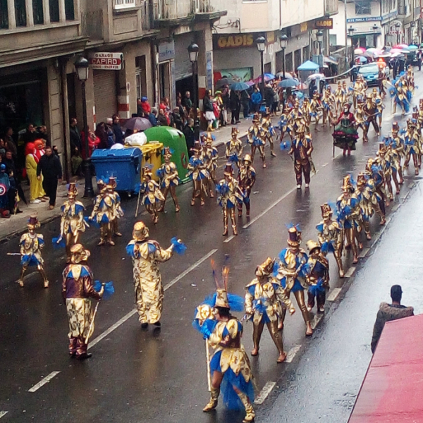 As 16 comparsas que desfilaron -non se presentaron dúas das que estaban inscritas- tardaron algo máis de dúas horas en completar o recorrido programado, con choiva incluida, que aínda que miuda, non cesou durante todo o tempo que durou o desfile, que como cada ano congregou a numeroso público a pesar do tempo desapacible da xornada, con choiva e tamén con temperaturas moi frias.